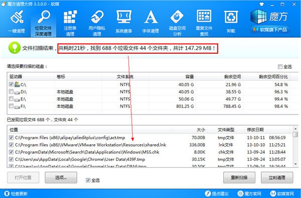 3、魔方清理大師還提供了“垃圾文件深度清理”功能,深度掃描系統(tǒng)垃圾文件、緩存文件、臨時文件,甚至你還可以添加需要清理的文件類型,其他的直接交給魔方掃描清理即可。