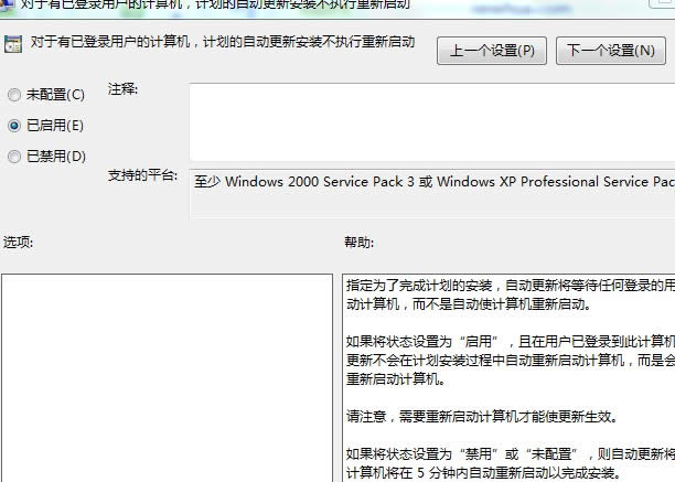 在右邊的選項中雙擊“對于已登錄的用戶,計劃的自動更新安裝不執(zhí)行重新啟動”選項,在屬性窗口內(nèi)設(shè)置,默認(rèn)為“未配置”,這里我們需要選擇下方的“已啟用”。