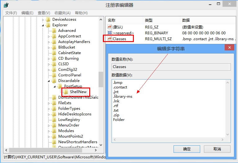 2.打開注冊表后依次找到 HKEY_CURRENT_USER\Software\Microsoft\Windows\CurrentVersion\Explorer\Discardable\PostSetup\ShellNew\Classes,右鍵點(diǎn)擊修改。填出修改框之后自己調(diào)整需要修改的文件順序,點(diǎn)擊確定。