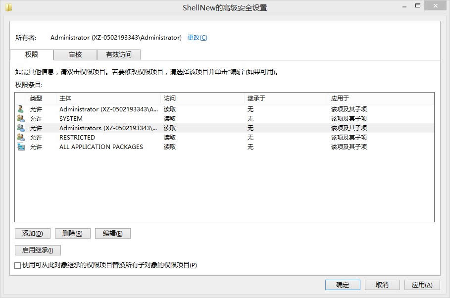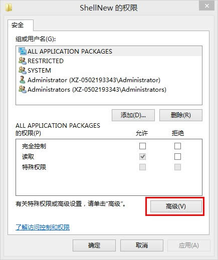 5.在ShellNew的高級安全設(shè)置中一共有5個選項,這里需要更改前三個選項。這里以第一個為例