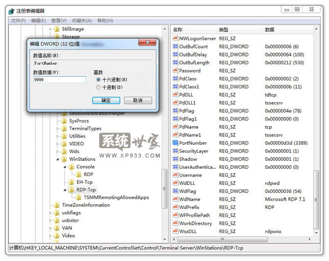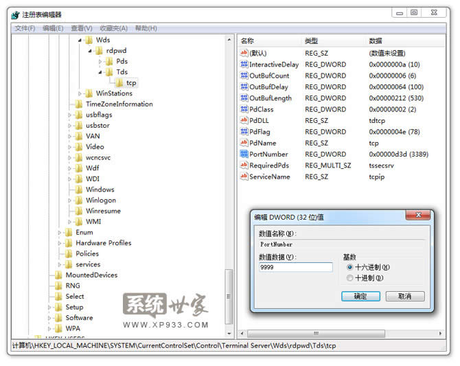 在RDP-Tcp子鍵所對應的右側顯示區域中,我們同樣會看到一個名為PortNumber的子鍵,把該子鍵的數值也要一并修改過來,例如這里我們也要將它的數值修改成“9999”;