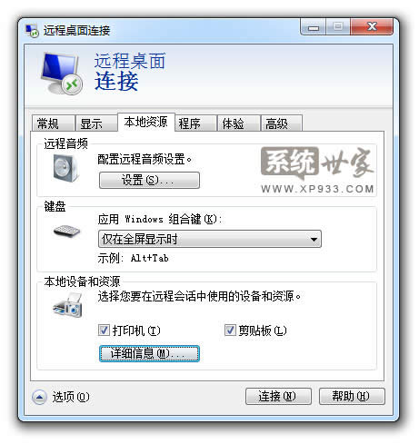單擊該界面中的“選項”按鈕,并在其后彈出的選項設置窗口,單擊“本地資源”標簽,打開如圖所示的標簽設置頁面選中其中的“打印機”,“剪貼板”項目,再單擊“連接”按鈕,開始進行遠程桌面連接。