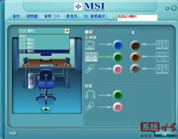 win7安裝后出現較多的問題故障是聲卡問題,如何解決安裝完win7后 hd聲卡音量故障,今天深度技術給大家詳細介紹一下關于怎么調整HD聲卡的音量的問題。 安裝完win7后 hd聲卡音量怎么調整:(以微星MSI主板為例說明) 1.選擇“音頻I/O”,將“2CH喇叭”改為“8CH喇叭”這樣做可以解決游戲內聲音小的問題