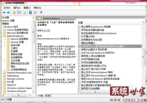 3、然后依次展開“計(jì)算機(jī)配置》管理模板》Windows組件》Internet Explorer項(xiàng)目”,在右側(cè)找到并雙擊“允許用戶從“工具”菜單啟用和使用企業(yè)模式”項(xiàng);