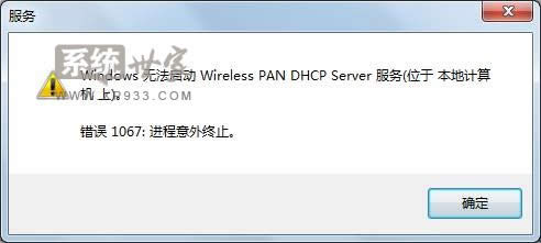 Windows 7系統(tǒng)使用無(wú)線時(shí)提示“windows無(wú)法啟動(dòng)wireless pan dhcp server服務(wù)"(位于本地計(jì)算機(jī)上)。錯(cuò)誤1067:進(jìn)程意外終止。如下圖所示: