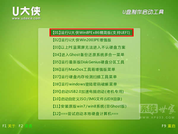 1)當(dāng)我們利用按快捷鍵選擇您的U盤啟動(dòng)進(jìn)入到U大俠主菜單后,按上下↑↓方向鍵選擇到“【01】 運(yùn)行U大俠Win8PEx86精簡版(支持UEFI)”,然后按下“回車鍵”,將進(jìn)入U(xiǎn)大俠Win8PE系統(tǒng),如下圖: