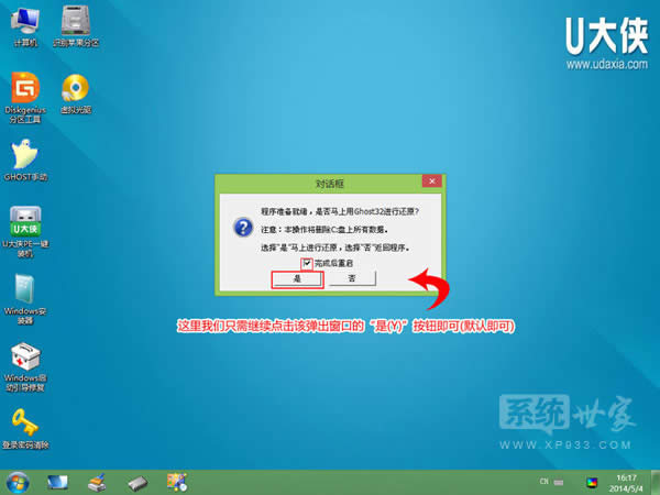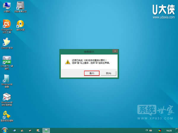 4)運(yùn)行“U大俠PE一鍵裝機(jī)”工具后,該軟件會(huì)自動(dòng)識(shí)別ISO鏡像文件(即剛才我們下載復(fù)制到U盤GHO文件夾里面的那個(gè)ISO鏡像包),并自動(dòng)提取里面的GHO文件。我們只需點(diǎn)擊“確定(Y)”按鈕即可!如下圖所示: