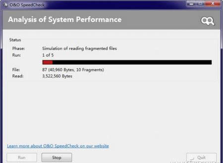 這里的時效性并非新聞的時效性,而是指用戶什么時候進行碎片整理才是最佳時間?如何知道碎片整理后,能為我們帶來多小性能的提升呢?這款叫O&O SpeedCheck的軟件,將會告訴你磁盤性能潛力有多少。 第1步:運行安裝程序,在初始界面中,你會看到軟件的使用原理及分析過程,值得注意的是,在分析的過程中盡量不要運行其他應用程序,以免影響分析的準確性。點擊左下角的“Run”按鈕即可開始分析。 第2步:接下來軟件會模擬讀取碎片文件,為了能夠達到準確分析,這個模擬過程將會重復5次。如圖(O&OSpeedcheck.jpg),稍后的模擬磁盤整理之后的文件讀取也會被模擬5次。模擬結束后,軟件將會對比顯示磁盤整理前后的文件讀取時間,并且告訴你碎片整理將會增加多少文件讀取性能。如果顯示的性能提升較大,比如80%以上,那么建議立即進行一次碎片整理。