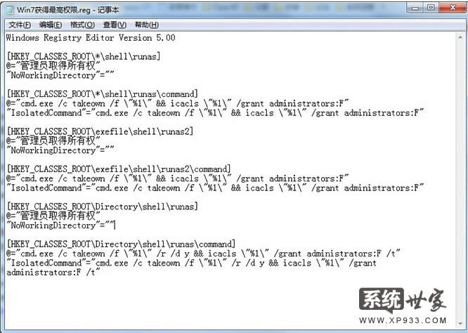 Windows 7,中文名稱視窗7,是由微軟公司(Microsoft)開發的操作系統,內核版本號為Windows NT 6.1。Windows 7可供家庭及商業工作環境:筆記本電腦 、平板電腦 、多媒體中心等使用。Windows 7可供選擇的版本有:入門版(Starter)、家庭普通版(Home Basic)、家庭高級版(Home Premium)、專業版(Professional)、企業版(Enterprise)(非零售)、旗艦版(Ultimate)。 完成某項操作,那么如何在win7下快速獲取高級管理員權限?下面技術員聯盟win7系統詳解快速獲取高級管理員權限技巧來介紹一下吧! 其實很簡單,我們只需要建立一個記事本文件,然后將小編下面給出的代碼復制進去,然后再另存為".reg"格式,完成之后再雙擊該文件即可。