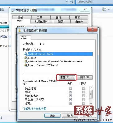 接下來(lái),我們將屬性窗口切換到安全欄目下,然后點(diǎn)擊編輯選項(xiàng)。接下來(lái)點(diǎn)擊添加。
