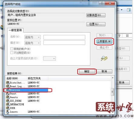 在新彈出來(lái)的選擇用戶(hù)組界面中,我們點(diǎn)擊最底部的高級(jí)選項(xiàng),然后找到右邊的立即查找,這個(gè)時(shí)候底部會(huì)出現(xiàn)查找的選項(xiàng),我們找到win7 everyone權(quán)限就好,選中并點(diǎn)擊確定。