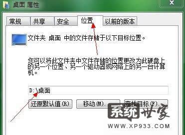 3,在桌面文件夾上右鍵屬性,位置,然后在下面默認位置改成D:\桌面