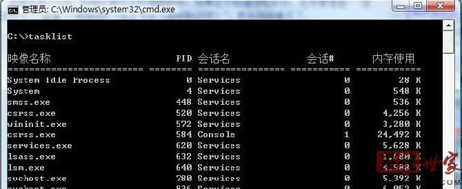 2、在打開的命令提示符窗口中然后輸入:tasklist可以查看到現在所有進程。