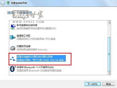 3、在打開的選項(xiàng)中選擇“設(shè)置無線臨時(shí)網(wǎng)絡(luò)”,點(diǎn)擊下一步,如圖所示: