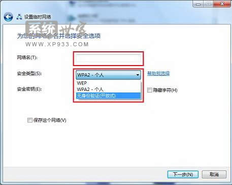 4、為創(chuàng)建的網(wǎng)絡(luò)命名并選擇合適的安全類型,如圖所示: