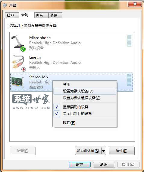 4.最后繼續使用鼠標右擊“立體聲混音”點擊“設置為默認設備”;如下圖所示: