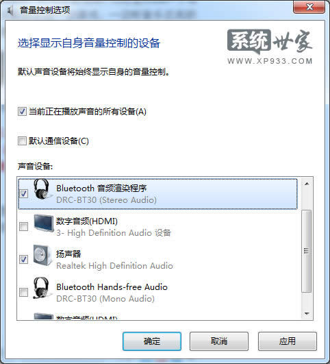 打開(kāi)音量控制選項(xiàng),聲音設(shè)備中也會(huì)出現(xiàn)“Bluetooth音頻渲染程序”,鉤選藍(lán)牙程序和揚(yáng)聲器