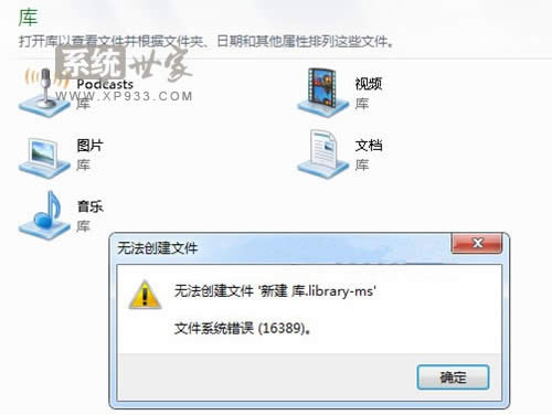 在Win7中使用“庫”功能可以讓電腦中的文件更易于管理和查找。在默認(rèn)情況下,Win7系統(tǒng)會(huì)提供文檔庫、音樂庫、圖片庫和視頻庫這幾個(gè)常用庫。當(dāng)然,我們也可以根據(jù)需要或自己的使用風(fēng)格在Win7系統(tǒng)中創(chuàng)建自己的庫。“庫”功能是Win7系統(tǒng)才開始出現(xiàn),它可以幫你把文件更好的分類,可以創(chuàng)建文檔庫、音樂庫、圖片庫和視頻庫等,也可以新建庫。但是最近,有朋友向小編詢問,自己在電腦上新建“庫”的時(shí)候,出現(xiàn)了“無法創(chuàng)建文件 ‘新建 庫.library-ms’文件系統(tǒng)錯(cuò)誤(16389)”的提示信息,正如下圖所示。
