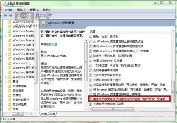 第三步、鼠標(biāo)點(diǎn)擊打開“Windows 資源管理器”,在右側(cè)窗口中找到‘阻止用戶將文件添加到與該用戶對(duì)應(yīng)的“用戶文件”文件夾的根目錄下’,并且雙擊打開該文件。