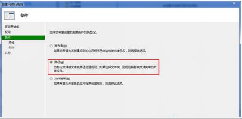 4、在左側窗格中選擇“條件”,在條件界面中,設置“限制”路徑,點擊進入下一步操作,在瀏覽文件按鈕中選擇病毒文件,再點擊創建按鈕。