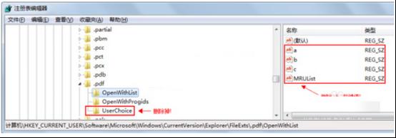 5、找到以下注冊項“HKEY_CURRENT_USER/Software/Microsoft/Windows/CurrentVersion/Explorer/FileExts/.pdf (提示:此處對應你當前的文件后綴,小編這里以 .pdf 為例)”如圖刪除“OpenWithList”下的除“(默認)”外的注冊表鍵值以及“UserChoice”。