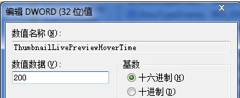 4、雙擊打開這個新建的ThumbnailLivePreviewHoverTime鍵值,在數(shù)值數(shù)據(jù)處錄入200,表示為2秒的意思,再點擊確定按鈕保存后退出注冊表編輯器。