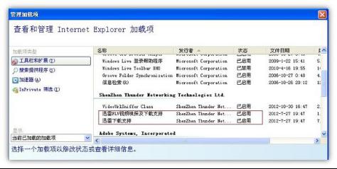 2、查看管理加載項(xiàng)是否未啟用或不齊全的問題。在瀏覽器點(diǎn)擊“工具——internet選項(xiàng)——程序——管理加載項(xiàng)”,查看是否有”迅雷下載支持和迅雷FLV視頻嗅探及下載支持“這個(gè)兩個(gè)控件而且確保已經(jīng)啟用,如果沒有則重新安裝,禁用的情況點(diǎn)擊啟用即可。