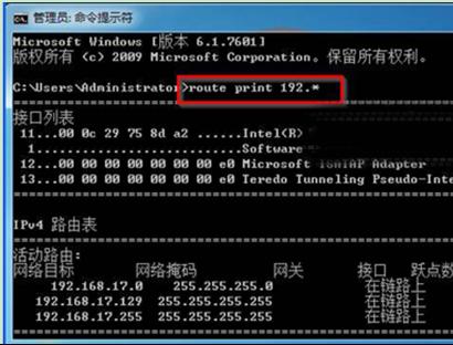 4、比如當(dāng)用戶還需查詢IP路由表里以“192”開(kāi)頭的路由信息的話,也可以在其中輸入“route print 192.*”命令后按回車鍵,就可查詢到192開(kāi)頭的IP路由信息了。