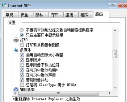 4、在Internet屬性中,切換到“高級”標簽頁,在設置面板上取消“在網頁中播放動畫”和“在網頁中播放聲音”的勾選,點擊“確定”按鈕保存即可。