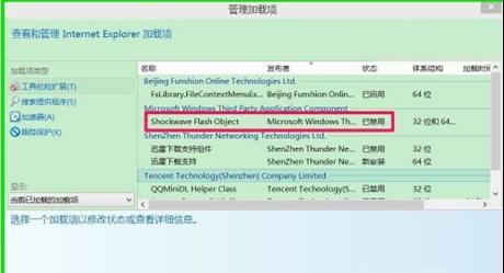 2、在打開的管理加載項(xiàng),可看到Shockwave Flash Object已禁用;