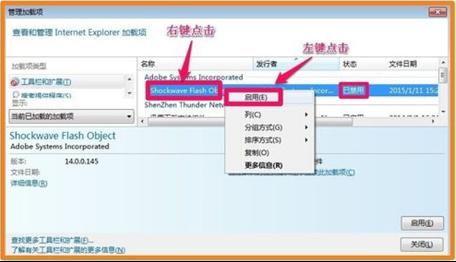 3、在管理加載項(xiàng)窗口,在Shockwave Flash Object右鍵選擇啟用。點(diǎn)擊“關(guān)閉”退出管理加載項(xiàng)即可。