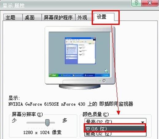 3、退回到桌面。右鍵點(diǎn)擊桌面、選擇屬性!進(jìn)入之后在上面選項(xiàng)卡選擇設(shè)置。然后把下面顏色質(zhì)量更改為16色的!
