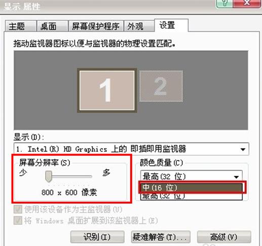 1、 右擊“桌面”選擇“屬性”。在顯示屬性中切換到“設(shè)計(jì)”選項(xiàng),然后把分辨率調(diào)到最低,800*600!,然后在把顏色質(zhì)量調(diào)整到16位!