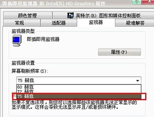 2、點(diǎn)擊高級(jí)按鈕,切換到“監(jiān)視器”選項(xiàng)卡,把“屏幕刷新頻率”調(diào)整75 赫茲,然后點(diǎn)擊確定。