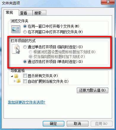 Windows 7,中文名稱視窗7,是由微軟公司(Microsoft)開發的操作系統,內核版本號為Windows NT 6.1。Windows 7可供家庭及商業工作環境:筆記本電腦 、平板電腦 、多媒體中心等使用。Windows 7可供選擇的版本有:入門版(Starter)、家庭普通版(Home Basic)、家庭高級版(Home Premium)、專業版(Professional)、企業版(Enterprise)(非零售)、旗艦版(Ultimate)。 今天小編給大家帶來的是設置win7系統單擊或雙擊打開項目的技巧。如果你對如何設置是單擊或雙擊打開項目感興趣的話,請一起來看看win7系統設置技巧吧,具體如下:1、雙擊打開計算機,在右上角的“組織”菜單中點擊選擇“文件夾和搜索選項”。 ![]() 2、在打開的“文件夾選項”常規標簽頁中,“打開項目的方式”便可根據自己的需要設置單擊或雙擊打開項目,確定保存后即可。 ![]() windows 7 的設計主要圍繞五個重點——針對筆記本電腦的特有設計;基于應用服務的設計;用戶的個性化;視聽娛樂的優化;用戶易用性的新引擎。 跳躍列表,系統故障快速修復等,這些新功能令Windows 7成為最易用的Windows。 |