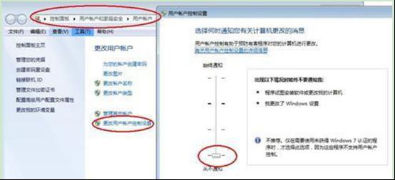 依次點擊“開始——控制面板-——用戶賬號和家庭安全——用戶賬號——更改用戶賬戶控制設(shè)置——左側(cè)拉到最下面(從不通知)”,設(shè)置完成后,重啟計算機即可。