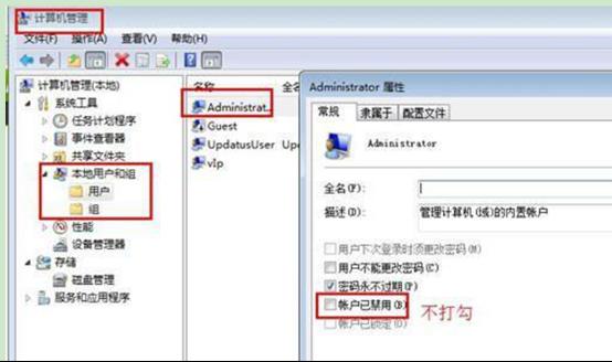 在我的電腦上右擊選擇“管理”,在打開的計算機管理界面中點擊“本地用戶組——用戶”,然后在右側(cè)列表中右擊administrator選擇屬性,在彈出的屬性窗口中,去掉“賬號已禁用”前面的勾選即可。