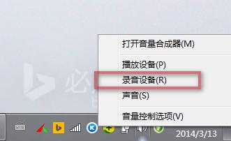 1、右擊聲音控制處的喇叭圖標,彈出如下圖所示菜單,選擇“錄音設備”,