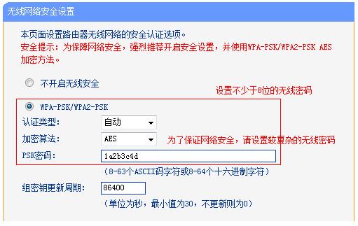 進(jìn)入“無線設(shè)置——無線安全設(shè)置”,在無線網(wǎng)絡(luò)安全設(shè)置窗口中選擇 WPA-PSK/WPA2-PSK,無線 PSK密碼處填寫不少于8位數(shù)的密碼,為了保障網(wǎng)絡(luò)安全,建議使用英文加數(shù)字混合的較為復(fù)雜的無線密碼。