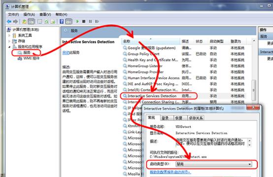 2.在彈出的"計算機管理"界面左側(cè)點擊"服務(wù)和應(yīng)用程序——服務(wù)",然后在右側(cè)列表找到并雙擊打開"Interactive Services Detection",在打開的屬性中將"啟動類型"設(shè)置為"禁用"。