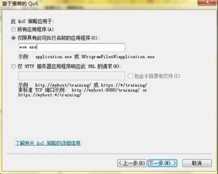 3、指定數(shù)據(jù)包的在QOS調(diào)度中的優(yōu)先級(jí)win7默認(rèn)所有的程序都是32,把魔獸世界調(diào)到比32大就可以了比如60. 填寫應(yīng)用這個(gè)策略的應(yīng)用程序,填寫Wow.exe即可.然后一直使用默認(rèn)設(shè)置。