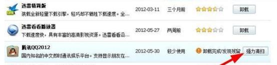 6、接著找到騰訊qq,你會發現存在殘留,點擊右側的【強力清掃】,我們進一步刪除無用的文件