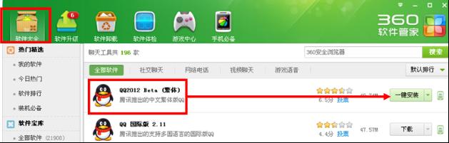 12、接著來到360安全衛士,在【軟件管家】中找到【軟件大全】,在軟件寶庫中你會看到有很多軟件,找到qq2012,然后點擊右側的一鍵安裝。等待幾分鐘,安裝就可以完成了。啟動你的qq,看看問題解決了沒有。