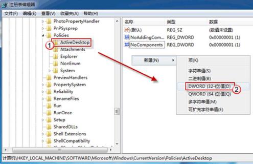 4、單擊展開(kāi) ActiveDesktop,在右側(cè)窗口中,選擇“新建->DWORD 值”,命名為 NoChangingWallPaper;