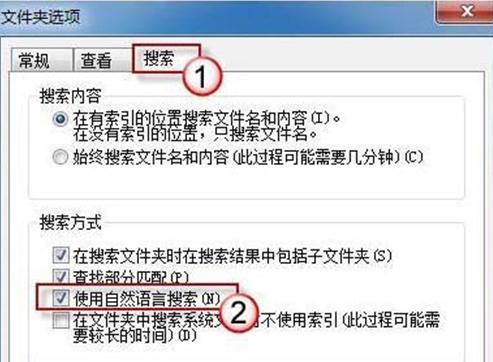 2、打開文件夾和搜索選項,切換到“搜索”選項卡下,勾選“使用自然語言搜索”項。