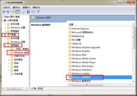 2、在打開的本地組策略編輯器,依次點擊“用戶配置”—— “管理模板”——“Windows組件”——雙擊“Windows錯誤報告”。