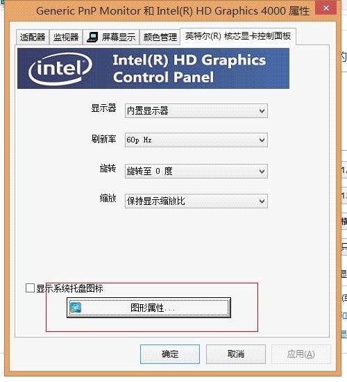 3、在核心顯卡屬性窗口中,切換到“英特爾核心顯卡控制面板”標簽頁,點擊“圖形屬性”設置按鈕。