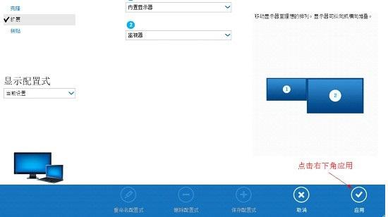 5、左側選擇克隆(復制)或者擴展等切換方式,點擊右下角“應用”按鈕來完成以上所有設置。