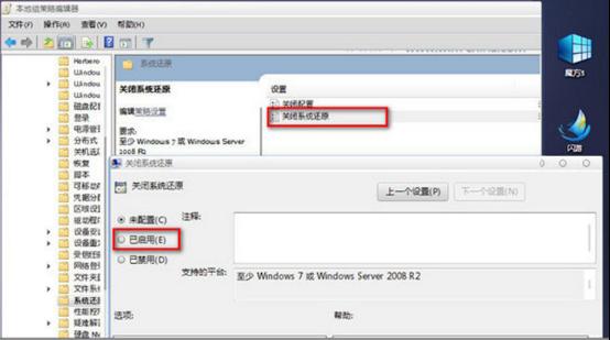 在組策略編輯器中依次展開“計(jì)算機(jī)配置→管理模板→系統(tǒng)→系統(tǒng)還原”,在右側(cè)雙擊“關(guān)閉系統(tǒng)還原”,設(shè)為“啟用”。