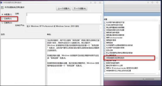 再次展開“計(jì)算機(jī)配置→管理模板→Windows組件→Windows Installer”,在右邊雙擊“關(guān)閉創(chuàng)建系統(tǒng)還原檢查點(diǎn)”,設(shè)為“啟用”。